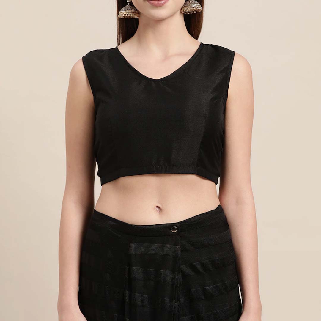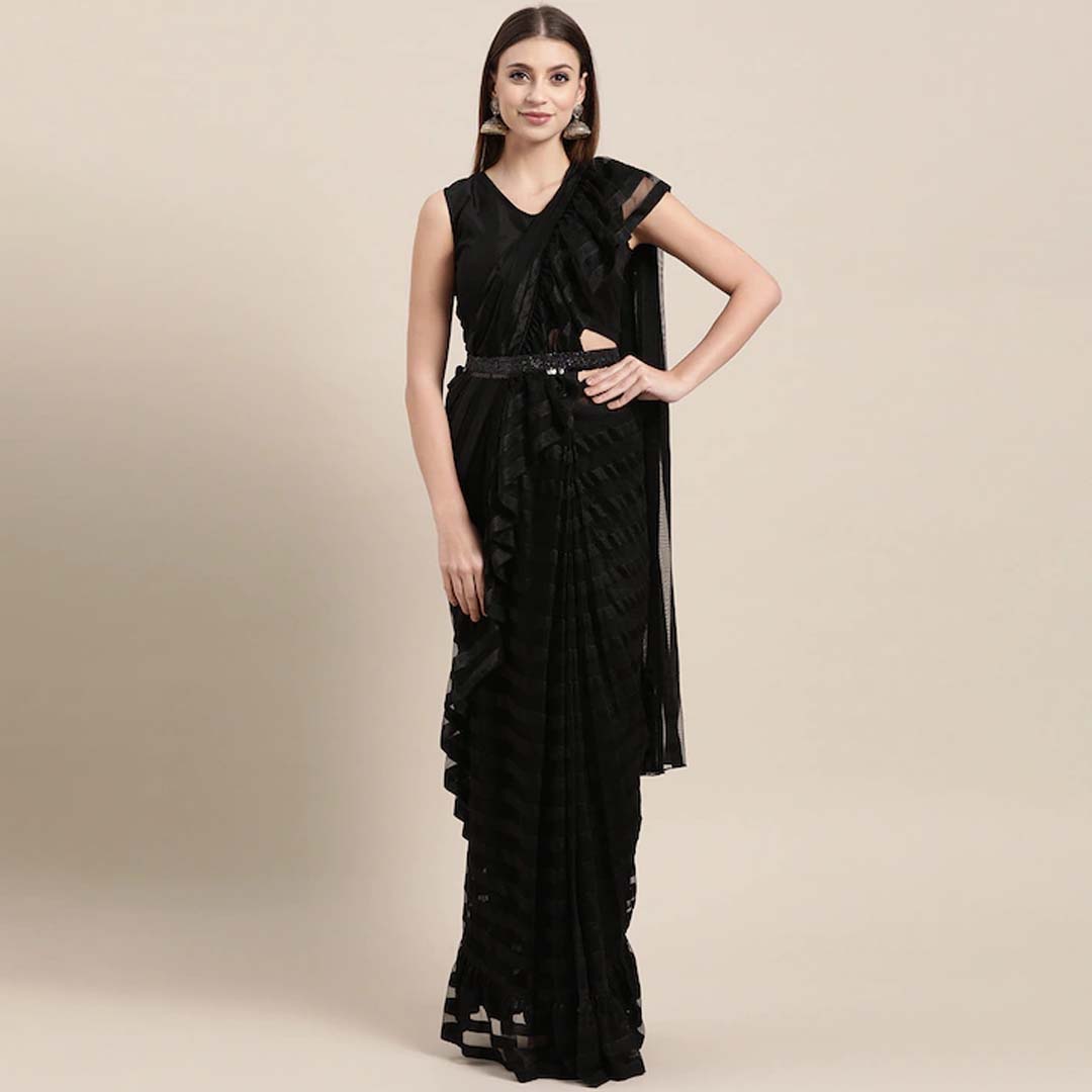 Black self-striped ruffled ready to wear saree, has snap button closure Comes with a stitched blouse in black, has a V-neck, sleeveless, tie-up closure