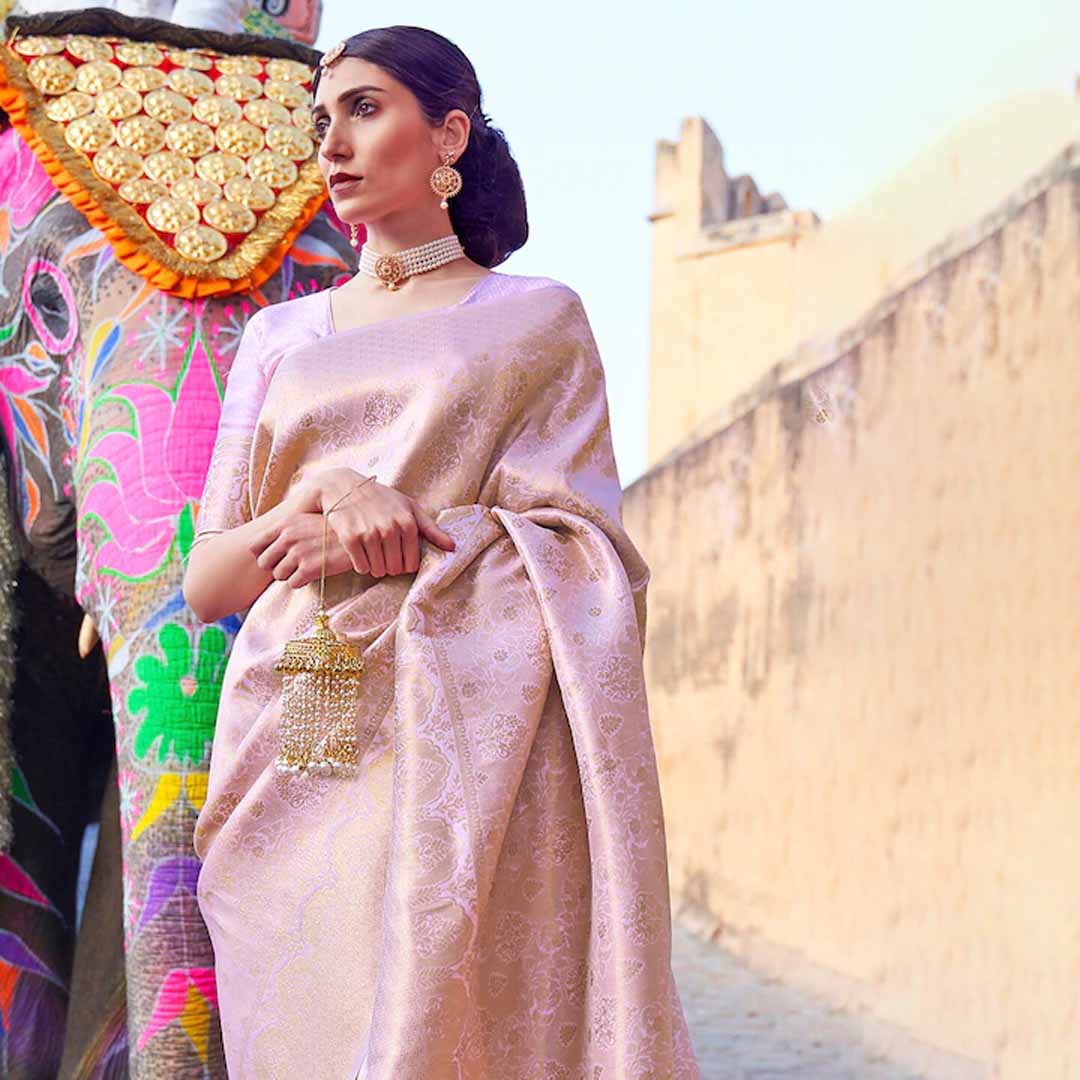 Lavender and gold-toned banarasi saree Woven design woven design saree with woven design border Has zari detail
