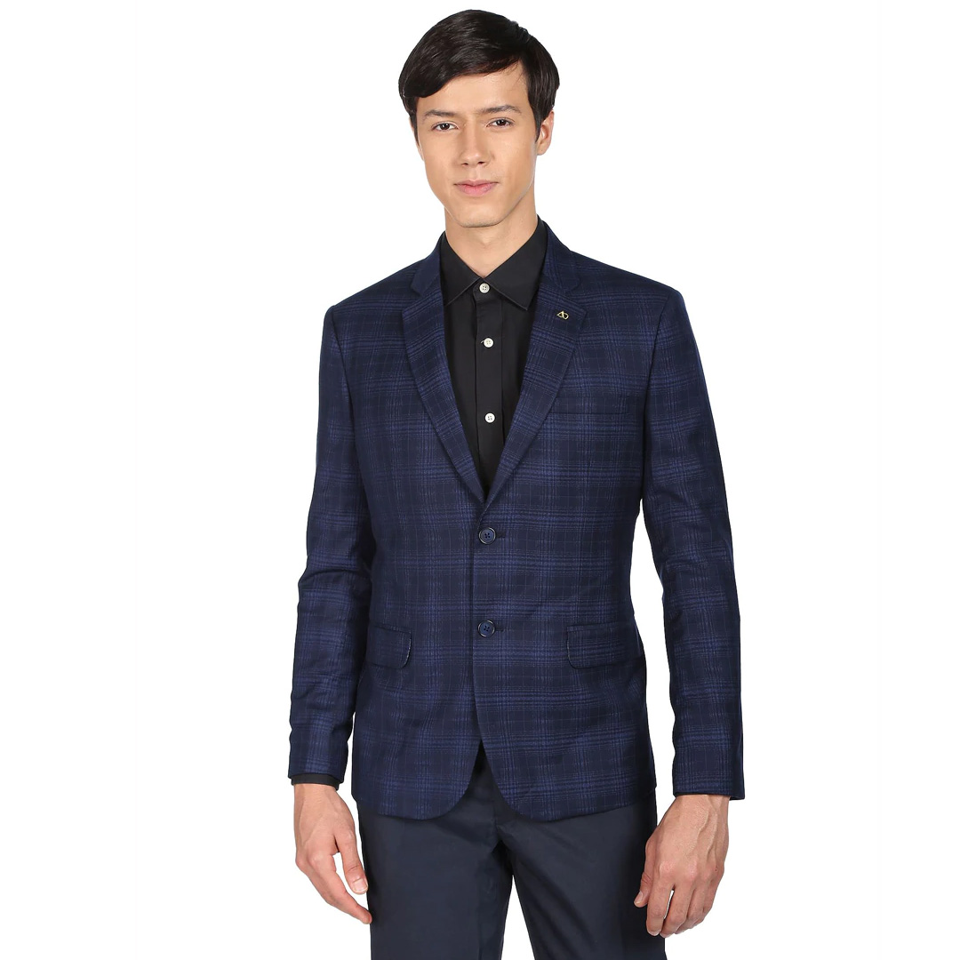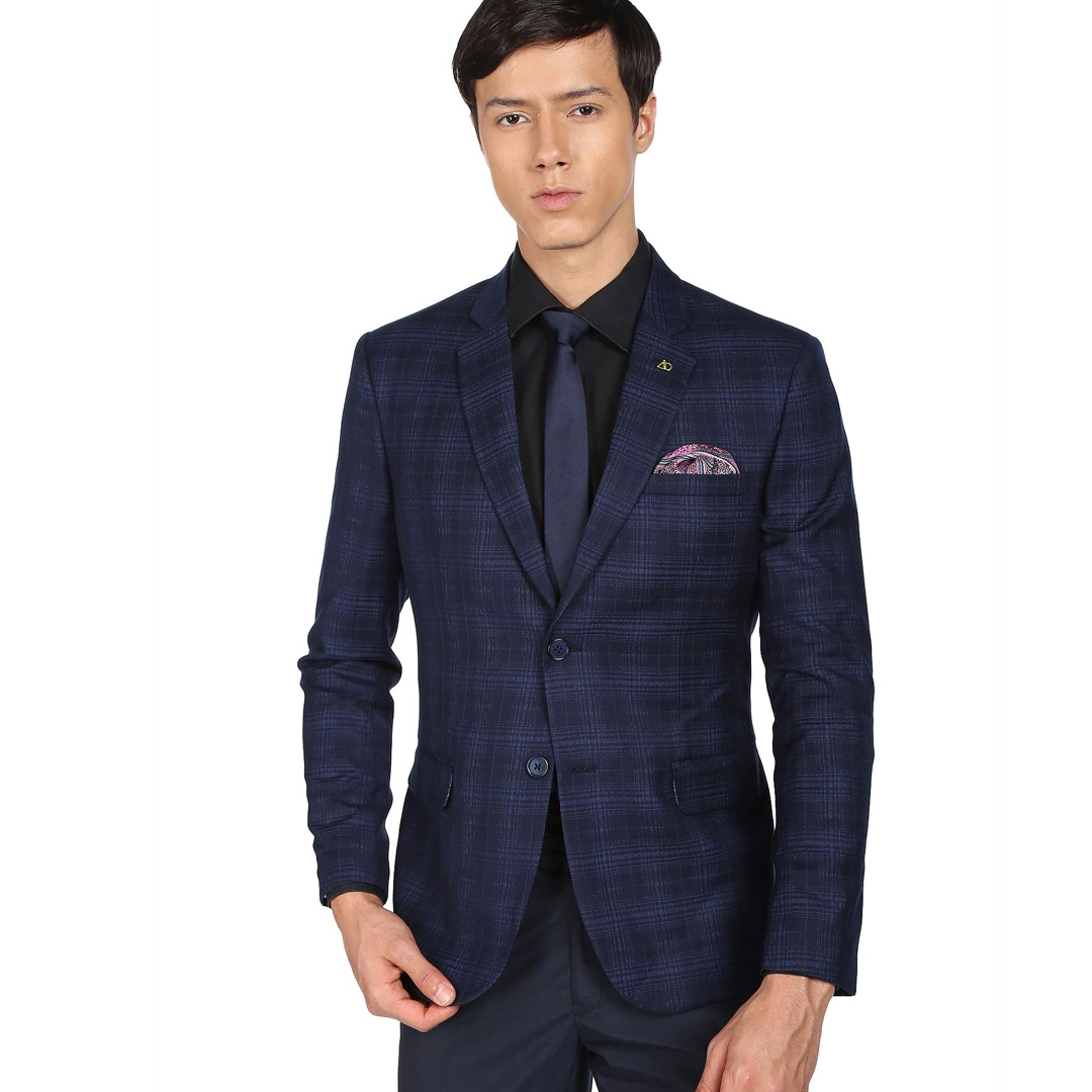 experience fine tailoring and an impeccable fit in the formal blazer. this tailored fit number is designed with a sharp notched lapel, metallic collar pin, long sleeves and a double vented back hemline.